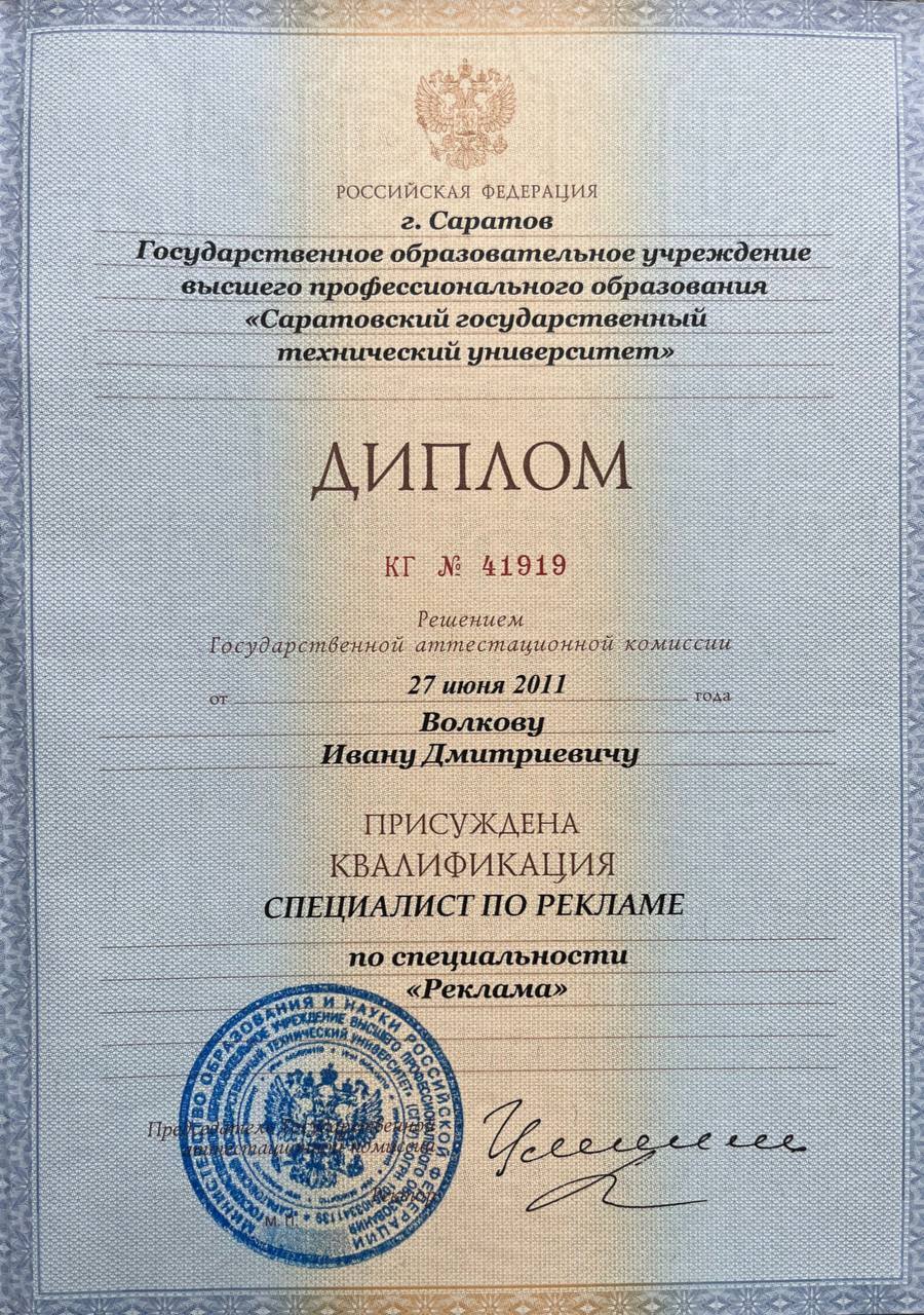 Высшее очное образование по специальности Реклама. Международные сертификаты Aptech (Мумбаи,Индия). Десятки конференций и форумов по маркетингу.